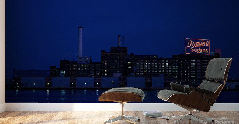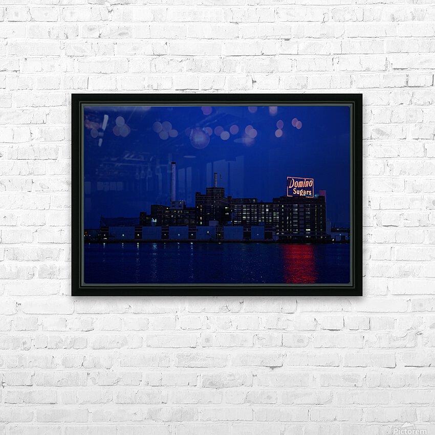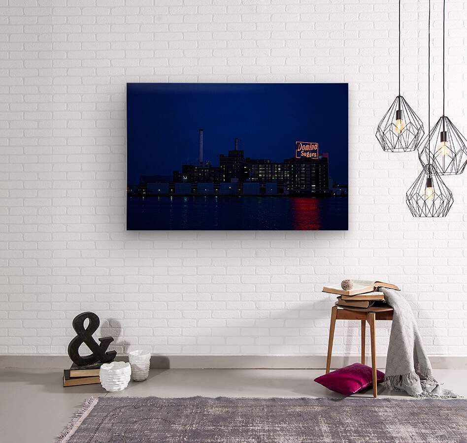 The Domino Sugar factory in Baltimore, MD, taken from across the Inner Harbor. Since this picture was taken, there have been changes and remodels to this building due to updates and a fire. The original factory, shown here in this photo, against the dark sky with the water from the harbor in the foreground, is a true piece of Baltimore history.