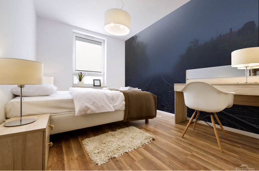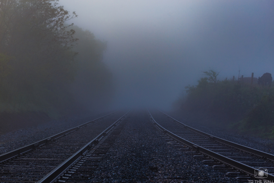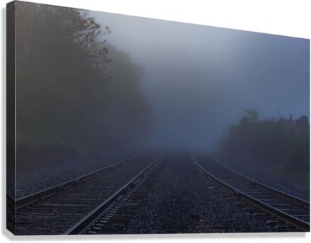 Dual train tracks lead you into heavy fog and mystery. Let your imagination take you away whenever you look at this photo and dream of where those tracks would take you.